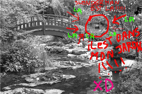 ‘Fin bon, aujourd’hui, j’étais tranquillement chez moi, je me penche par la fenêtre et Ô surprise, je crois voir Slendy. j’avoue que j’ai flippé un peu, je suis sortie, je me suis rapproché, pas de Slendy. je remonte je le revoie. C’était juste des branches d’arbres mais, ça lui ressemblaient de loin. Pendant trois minutes, j’ai cru en cette légende^^